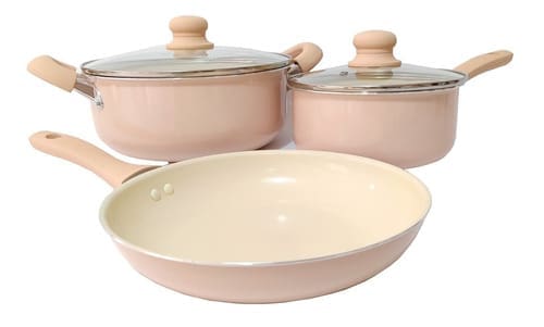 Marca: Hudson. Línea: Cerámica. Modelo: Antiadherente. Unidades: 5. Materiales: Aluminio. Con revestimiento antiadherente. Piezas incluidas: Cacerolas, Sartén, Tapas.