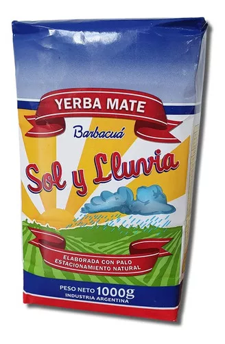 Yerba Sol y Lluvia, procedente de Misiones. Elaborada con palo, estacionamiento natural según método Barbacuá (deshidratación mediante la exposición al calor del fuego de leña de un selecto grupo de maderas, para irradiar un sabor y aroma inconfundible). Este sistema de secado tipo Barbacuá es el mismo que utilizaron los guaraníes hace más de 400 años.