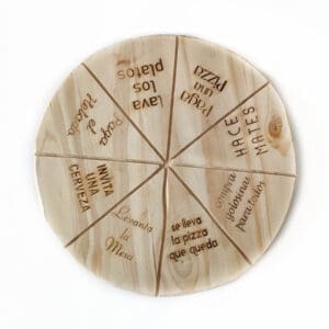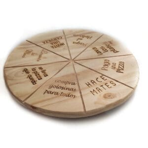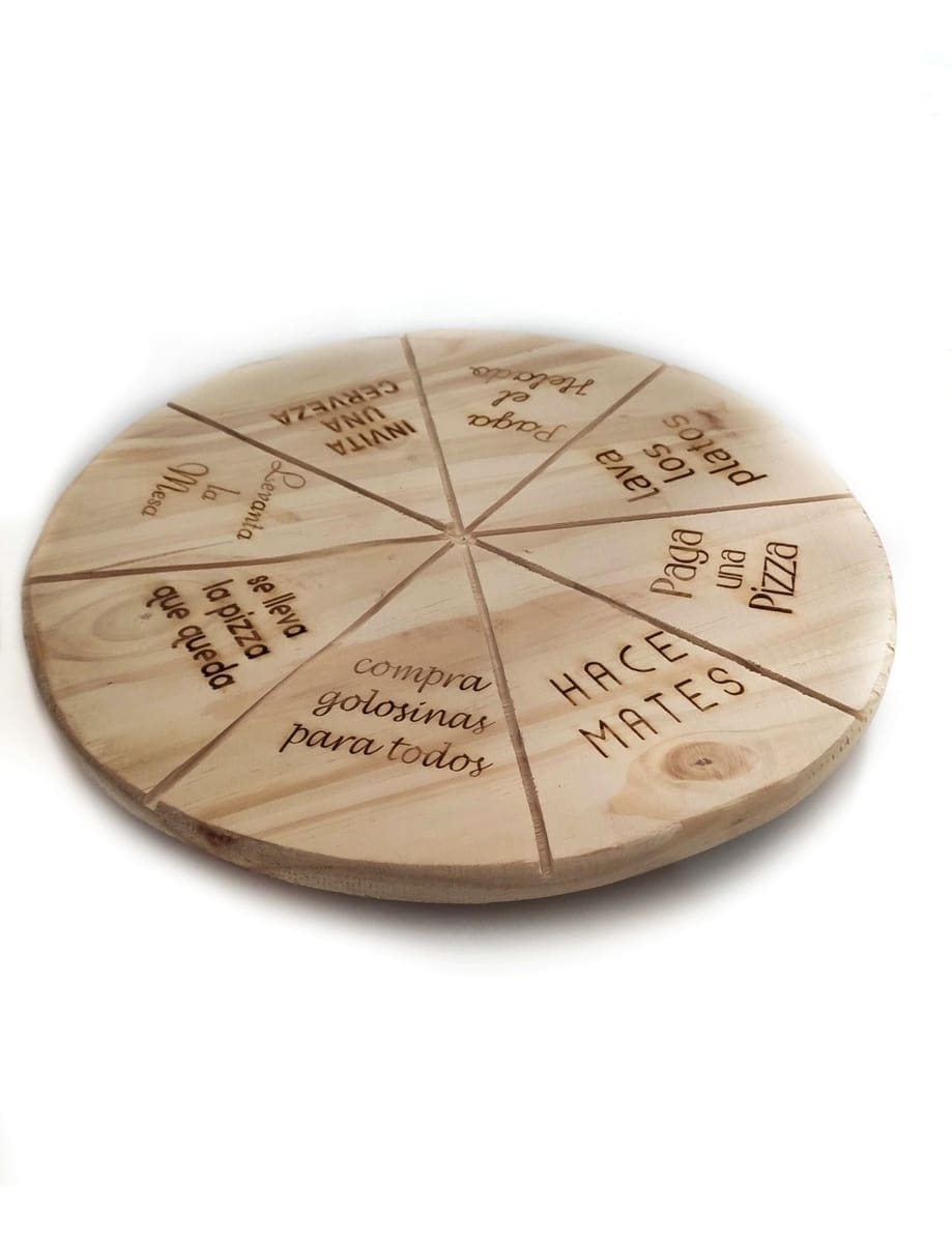 Trae Prendas grabadas en laser. Para que cada porción de la pizza tenga una prenda diferente!