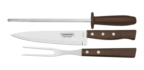 El juego para asado Tramontina con mango marrón de madera y polipropileno, 3 piezas, de la línea Churrasco viene con cuchillo para carne y trinchante con láminas de acero inoxidable, además de mangos de madera natural y remaches de aluminio. Para completar, una chaira con alma de acero al carbono cromado y mango de polipropileno.
