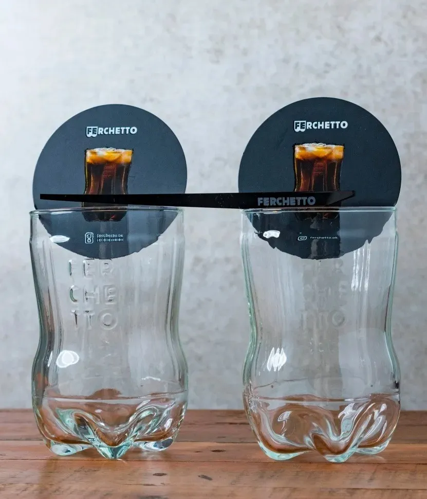 Contiene dos vasos Ferchetto de vidrio transparente de 800 ml., dos mezcladores de acrílico negro de 3 mm grabados y dos posavasos de cartulina triple con tratamiento de polipropileno y sectorizados UV.