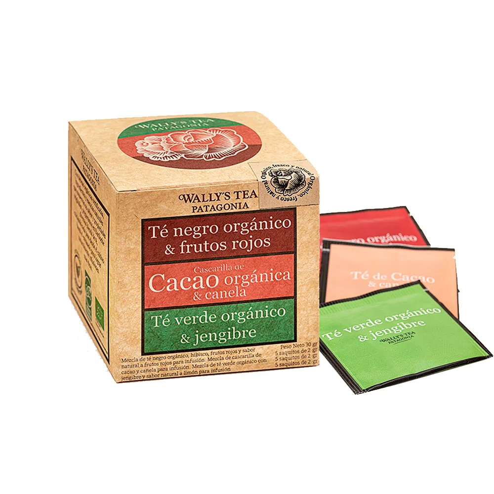Té negro orgánico, hibisco, arándano, cassis, frutilla, esencia natural de frutos rojos, cascarilla de cacao orgánica, canela, té verde orgánico, jengibre deshidratado, esencia natural de limón