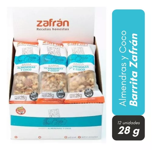 Disfruta de una deliciosa y saludable opción de snack con las Barritas de Almendra y Coco de Zafrán, en un práctico pack de 12 unidades. Cada barrita de 28 g está elaborada con ingredientes de calidad, ofreciendo un sabor exquisito de almendras y coco que te encantará. Además, son libres de gluten y aptas para intolerantes a la lactosa, lo que las convierte en una opción ideal para quienes buscan cuidar su alimentación sin renunciar al sabor. Lleva contigo estas barritas a donde quiera que vayas y disfruta de un snack delicioso y nutritivo en cualquier momento del día.