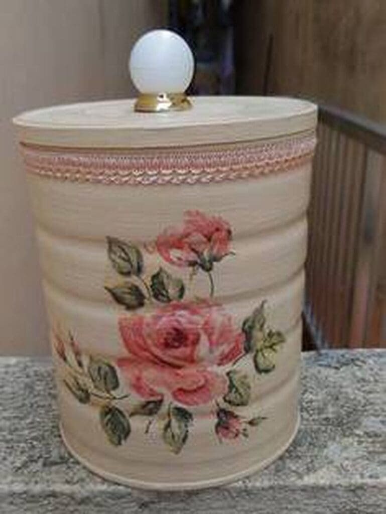 Toma la lata y píntala con pintura blanca en aerosol, deja secar y luego realiza la técnica decoupage sobre toda la superficie de la lata. Esto dará un hermoso resultado como si se hubiese pintado a mano. Después dale una mano de protección con barniz.