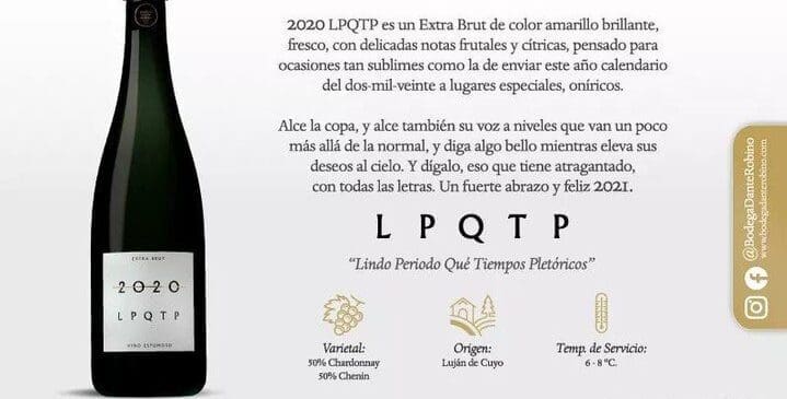 Noticias Leer más 2020 LPQTP: la verdadera historia del polémico espumante que revolucionó las redes 20/11/2020 / 659 Consultados por Clarín, en el área de Marketing de Dante Robino explicaron que el nombre del espumante es "Lindo Periodo Qué Tiempos Pletóricos", de ahí... Seguir leyendo